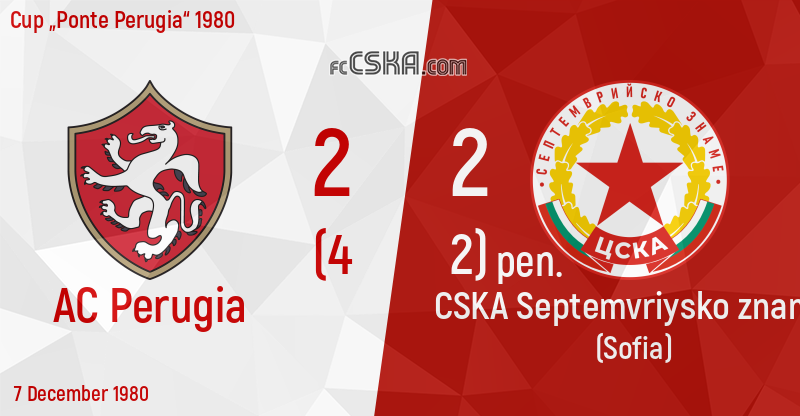 CSKA​ „Septemvriysko zname“ draw against AC Perugia with result 2:2 in match from Semifinals of Cup „Ponte Perugia“ 1980 played on 7 December 1980 on „Renato Curi“ stadium, in Perugia. goalscorers for the army men were Radoslav Zdravkov (32′), Nikola Velkov (80′) and neizvesten[1] (99′ from penalty and 101′ from penalty).