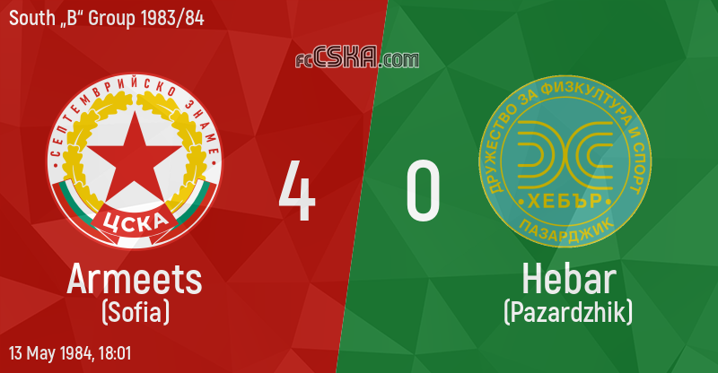 Armeets Sf won against Hebar (Pazardzhik) with result 4:0 in match from 29th round of South „B“ Group 1983/84 played on 13 May 1984 at 18:01
