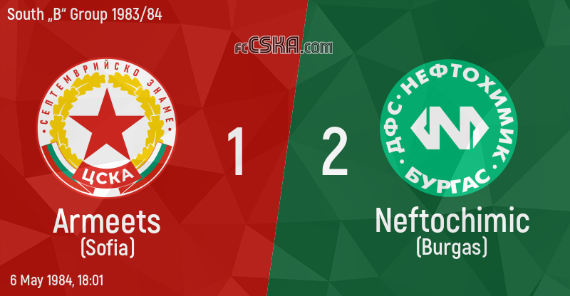 Armeets Sf lost against Neftochimic (Burgas) with result 1:2 in match from 28th round of South „B“ Group 1983/84 played on 6 May 1984 at 18:01