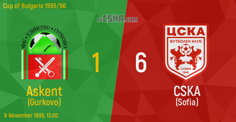 CSKA won against Askent (Gurkovo) with result 1:6 in match from Round of 32 of Cup of Bulgaria 1995/96 played on 8 November 1995 at 13:00 goalscorers for the army men were Rumen Hristov (18′), Boyko Velichkov (46′ and 73′), Georgi K. Georgiev (49′ and 75′) and Petar Zhabov (61′).