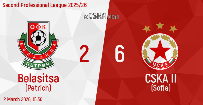 CSKA II​ won against Belasitsa (Petrich) with result 2:6 in match from 22nd round of Second Professional League 2025/26 played on 2 March 2026 at 15:30 on „Tsar Samuil“ stadium, in Petrich.