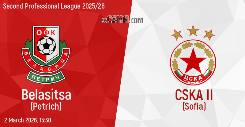 CSKA II will play with Belasitsa in match from 22nd round of Second Professional League 2025/26 on 2 March 2026 at 15:30 on „Tsar Samuil“ stadium, in Petrich.
