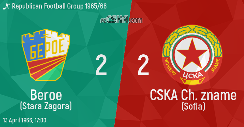 CSKA „Cherveno zname“ draw against Beroe (Stara Zagora) with result 2:2 in match from 20th round of „А“ Republican Football Group 1965/66 played on 13 April 1966 at 17:00 on „Gradski“ stadium, in Stara Zagora. goalscorers for the army men were Ivan Kolev (9′) and Dimitar Penev (62′).