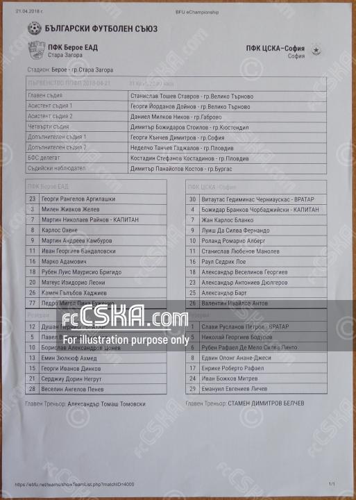 CSKA draw against Beroe (Stara Zagora) with result 1:1 in match from 33rd round of First Professional League 2017/18 - first six played on 21 April 2018 at 20:00 on „Beroe“ stadium, in Stara Zagora. goalscorer for the army men was Stanislav Manolev (55′).