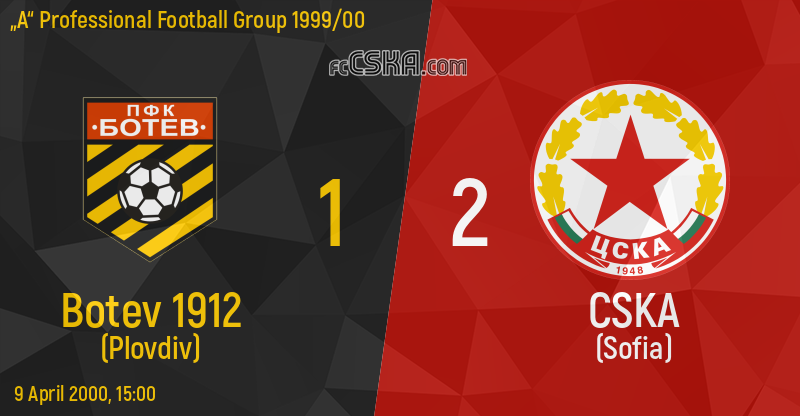 CSKA won against Botev 1912 (Plovdiv) with result 1:2 in match from 22nd round of „А“ Professional Football Group 1999/00 played on 9 April 2000 at 15:00 on „Hristo Botev“ stadium, in Plovdiv. goalscorers for the army men were Svetoslav Petrov (77′) and Galin Ivanov (90′).