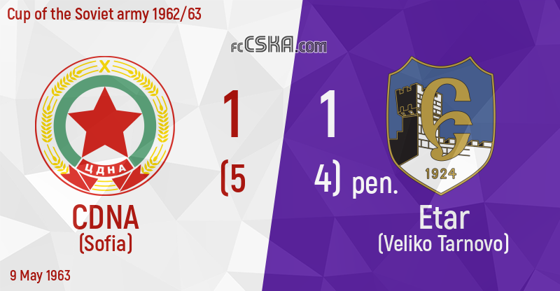 CDNA draw against Etar (Veliko Tarnovo) with result 1:1 in match from Round of 16 — Second Leg of Cup of the Soviet army 1962/63 played on 9 May 1963 on „Narodna armiya“ stadium, in Sofia. goalscorers for the army men were Ivan Kolev (40′), Stoyan Koshev (96′ from penalty), Nikola Kovachev (97′ from penalty), Ivan Rankov (98′ from penalty) and Nikola Tsanev (99′ from penalty).