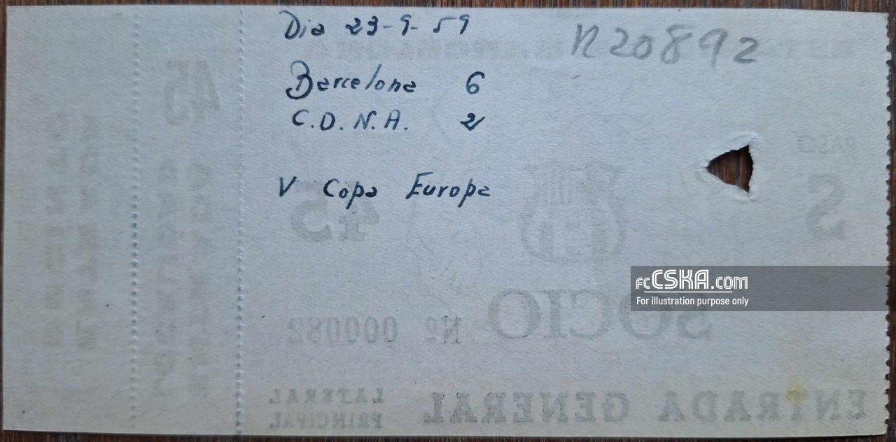 CDNA lost against CF Barcelona with result 6:2 in match from Qualifying round — Second Leg of European Champion Clubs' Cup 1959/60 played on 23 September 1959 at 22:30 on „Camp Nou“ stadium, in Barcelona. goalscorers for the army men were Dimitar Milanov (24′) and Bogomil Martinov (57′).