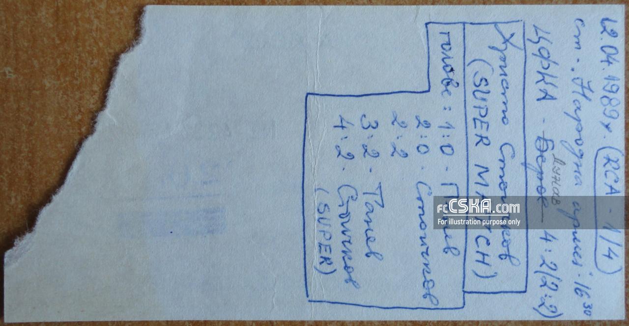 CFKA „Sredets“ won against Dunav (Ruse) with result 4:2 in match from Quarterfinal of Cup of the Soviet army 1988/89 played on 12 April 1989 on „Narodna armiya“ stadium, in Sofia. goalscorers for the army men were Lyuboslav Penev (15′), Hristo Stoichkov (24′ and 88′) and Lachezar Tanev (66′).