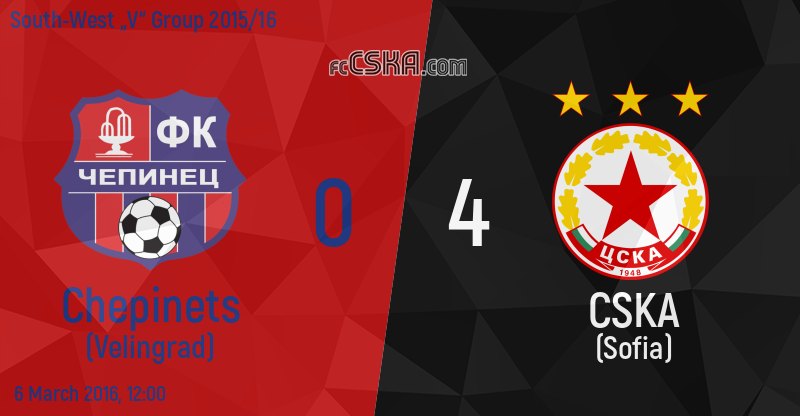 CSKA won against Chepinets (Velingrad) with result 0:4 in match from 20th round of South-West „V“ Group 2015/16 played on 6 March 2016 at 12:00 goalscorers for the army men were Samir Ayass (39′), Preslav Yordanov (47′ and 93′) and Aleksandar I. Aleksandrov (84′).