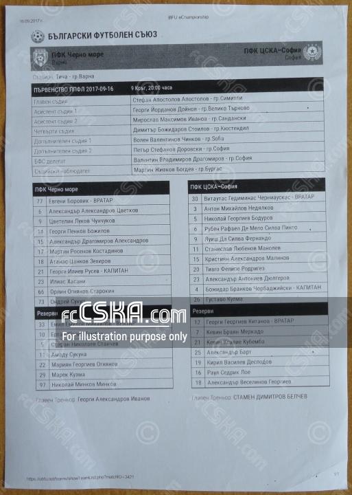 CSKA won against Cherno more (Varna) with result 0:1 in match from 9th round of First Professional League 2017/18 played on 16 September 2017 at 20:00 on „Ticha“ stadium, in Varna. goalscorer for the army men was Fernando Karanga (96′).