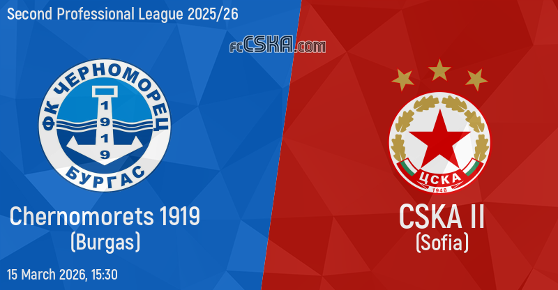 CSKA II will play with Chernomorets in match from 24th round of Second Professional League 2025/26 on 15 March 2026 at 15:30 on „Gradski“ stadium, in Nesebar.