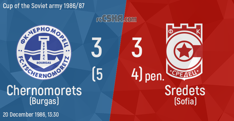 Sredets draw against Chernomorets (Burgas) with result 3:3 in match from Round of 16 of Cup of the Soviet army 1986/87 played on 20 December 1986 at 13:30 on „9-ti septemvri“ stadium, in Burgas. goalscorers for the army men were Lyuboslav Penev (29′ and 121′ from penalty), Emil Kostadinov (74′), Lachezar Tanev (95′ from penalty and 121′ from penalty), Ivaylo Kirov (121′ from penalty) and Georgi Velinov (121′ from penalty).