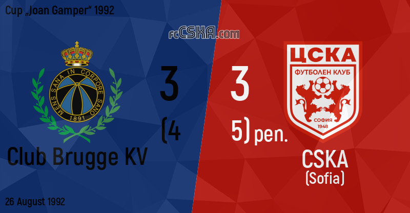 CSKA draw against Club Brugge KV with result 3:3 in match from Third place play-off of Cup „Joan Gamper“ 1992 played on 26 August 1992 on „Camp Nou“ stadium, in Barcelona. goalscorers for the army men were Boris Hvoynev (9′) and Vanyo Shishkov (51′ and 66′).