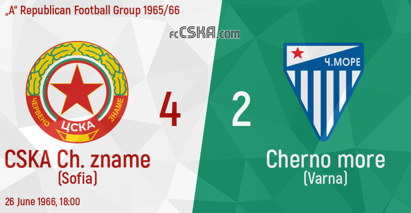 CSKA „Cherveno zname“ won against Cherno more (Varna) with result 4:2 in match from 30th round of „А“ Republican Football Group 1965/66 played on 26 June 1966 at 18:00 on „Narodna armiya“ stadium, in Sofia. goalscorers for the army men were Yanko Kirilov (28′, 34′ and 49′) and Ivan Vasilev (36′ from penalty).
