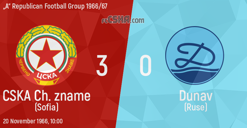 CSKA „Cherveno zname“ won against Dunav (Ruse) with result 3:0 in match from 11th round of „А“ Republican Football Group 1966/67 played on 20 November 1966 at 10:00 on „Narodna armiya“ stadium, in Sofia. goalscorers for the army men were Asparuh Nikodimov (15′), Nikola Tsanev (62′) and Dimitar Yakimov (67′).