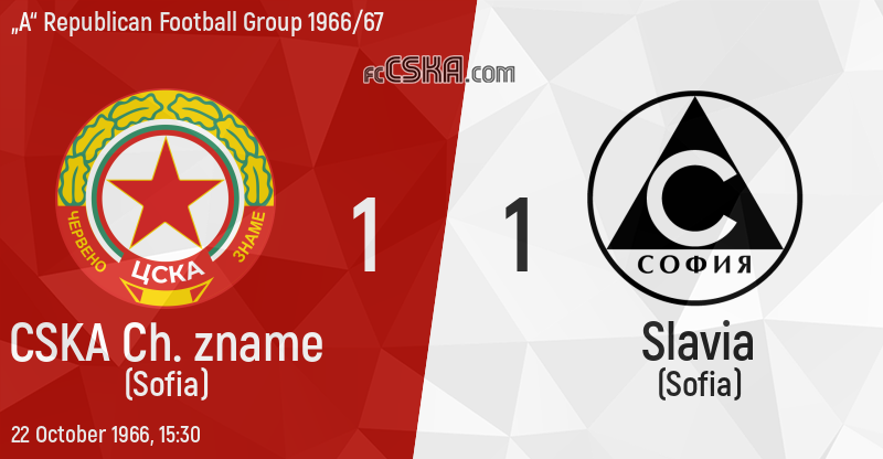 CSKA „Cherveno zname“ draw against Slavia (Sofia) with result 1:1 in match from 9th round of „А“ Republican Football Group 1966/67 played on 22 October 1966 at 15:30 on „Narodna armiya“ stadium, in Sofia. goalscorer for the army men was Ivan Vasilev (62′).