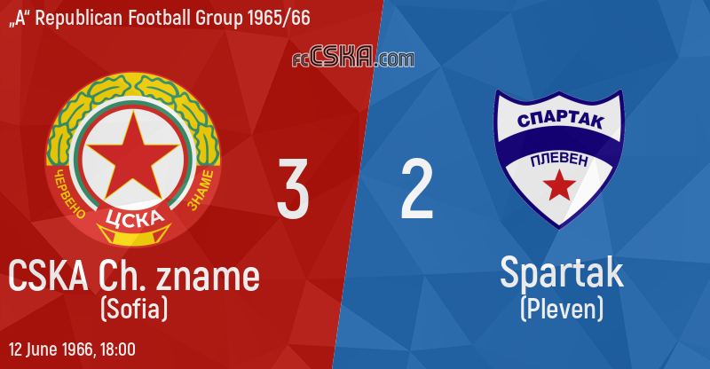 CSKA „Cherveno zname“ won against Spartak (Pleven) with result 3:2 in match from 28th round of „А“ Republican Football Group 1965/66 played on 12 June 1966 at 18:00 on „Narodna armiya“ stadium, in Sofia. goalscorer for the army men was Nikola Tsanev (2′ and 69′). Auto goal for the guests scored Zdravko Chenkov[1] (59′).