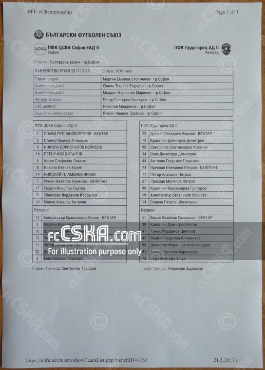 CSKA II lost against Ludogorets 1945 II (Razgrad) with result 0:2 in match from 29th round of Second Professional League 2016/17 played on 21 May 2017 at 18:00 on „Bulgarska armia“ stadium, in Sofia.
