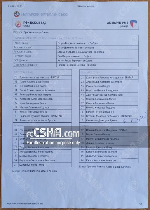 CSKA II lost against Marek 1915 (Dupnitsa) with result 0:1 in match from 27th round of Second Professional League 2025/26 played on 5 April 2026 at 17:00