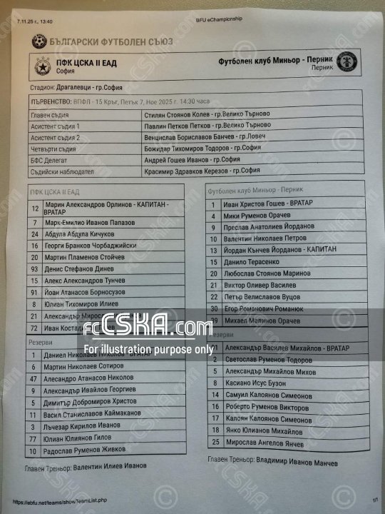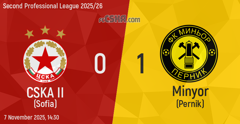 CSKA II lost against Minyor (Pernik) with result 0:1 in match from 15th round of Second Professional League 2025/26 played on 7 November 2025 at 14:30