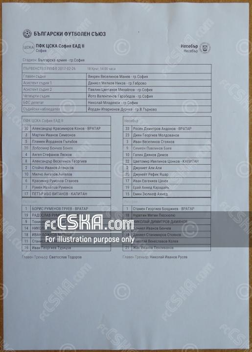 CSKA II won against Nesebar (Nesebar) with result 2:0 in match from 18th round of Second Professional League 2016/17 played on 26 February 2017 at 14:00 on „Bulgarska armia“ stadium, in Sofia.