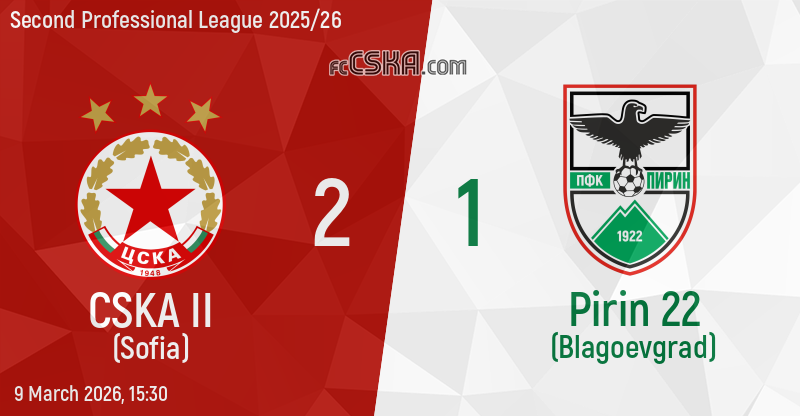 CSKA II won against Pirin 22 (Blagoevgrad) with result 2:1 in match from 23rd round of Second Professional League 2025/26 played on 9 March 2026 at 15:30