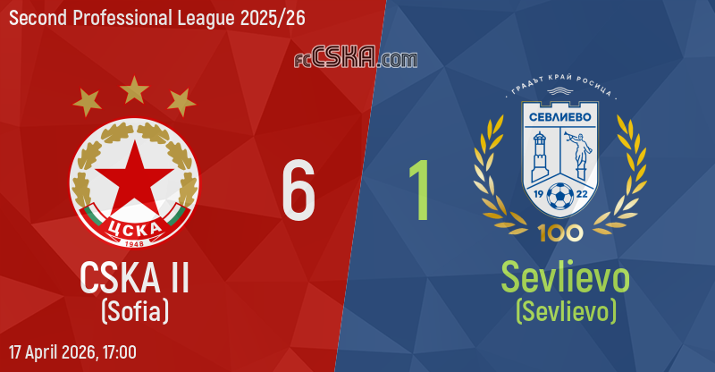 CSKA II won against Sevlievo (Sevlievo) with result 6:1 in match from 29th round of Second Professional League 2025/26 played on 17 April 2026 at 17:00