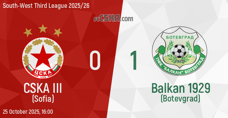 CSKA III lost against Balkan 1929 (Botevgrad) with result 0:1 in match from 14th round of South-West Third League 2025/26 played on 25 October 2025 at 16:00 on „Benkovski“ stadium, in Kostenets.