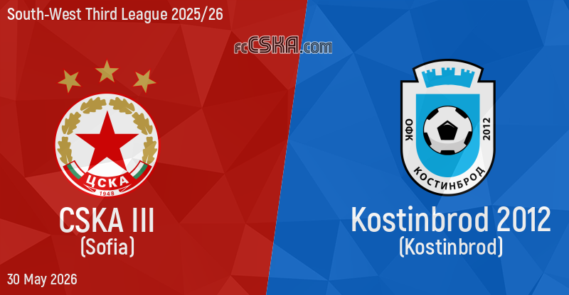 CSKA III will play with Kostinbrod in match from 34th round of South-West Third League 2025/26 on 30 May 2026 on „Benkovski“ stadium, in Kostenets. the match will translated live on „Sportbg.bg”.