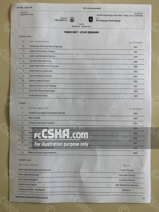 CSKA III won against Oborishte (Panagyurishte) with result 4:1 in match from 7th round of South-West Third League 2025/26 played on 13 September 2025 at 17:00 on „Benkovski“ stadium, in Kostenets.