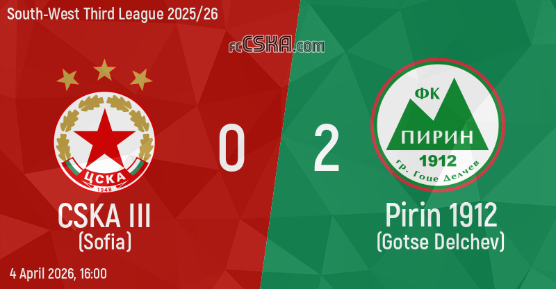 CSKA III lost against Pirin 1912 (Gotse Delchev) with result 0:2 in match from 26th round of South-West Third League 2025/26 played on 4 April 2026 at 16:00 on „Benkovski“ stadium, in Kostenets.
