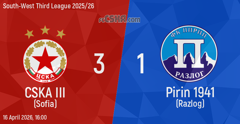 CSKA III won against Pirin 1941 (Razlog) with result 3:1 in match from 28th round of South-West Third League 2025/26 played on 16 April 2026 at 16:00 on „Benkovski“ stadium, in Kostenets.