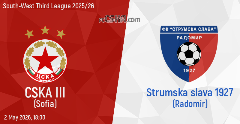 CSKA III will play with Strumska slava in match from 30th round of South-West Third League 2025/26 on 2 May 2026 at 18:00 on „Benkovski“ stadium, in Kostenets. the match will translated live on „Sportbg.bg”.
