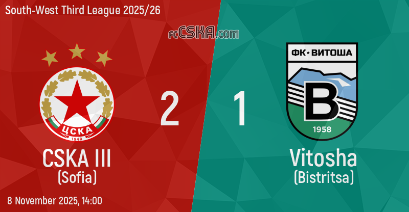 CSKA III won against Vitosha (Bistritsa) with result 2:1 in match from 16th round of South-West Third League 2025/26 played on 8 November 2025 at 14:00 on „Benkovski“ stadium, in Kostenets.