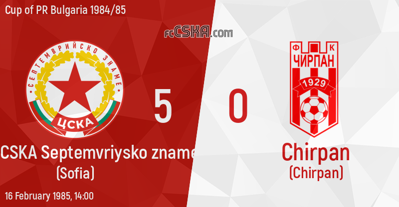 CSKA „Septemvriysko zname“ won against Chirpan (Chirpan) with result 5:0 in match from Fourth round — Second Leg of Cup of PR Bulgaria 1984/85 played on 16 February 1985 at 14:00 goalscorers for the army men were Plamen Markov (45′), Hristo Stoichkov (51′), Georgi Slavkov (64′), Ilia Voynov (71′) and Radoslav Zdravkov (80′ from penalty).