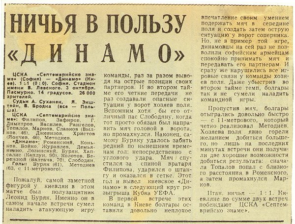 CSKA „Septemvriysko zname“ draw against Dinamo (Kiev) with result 1:1 in match from Round of 64 — Second Leg of UEFA Cup 1979/80 played on 3 October 1979 at 18:30 on „Vasil Levski“ stadium, in Sofia. goalscorer for the army men was Ivan Metodiev (63′ from penalty).