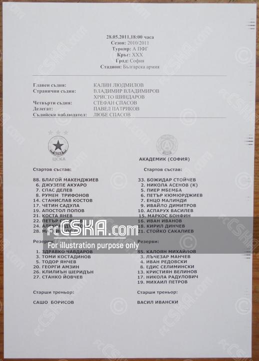 CSKA won against Akademik 1947 (Sofia) with result 3:1 in match from 30th round of „А“ Football Group 2010/11 played on 28 May 2011 at 18:00 on „Bulgarska armia“ stadium, in Sofia. goalscorers for the army men were Stanislav Kostov (38′), Cillian Sheridan (71′) and Spas Delev (90′).