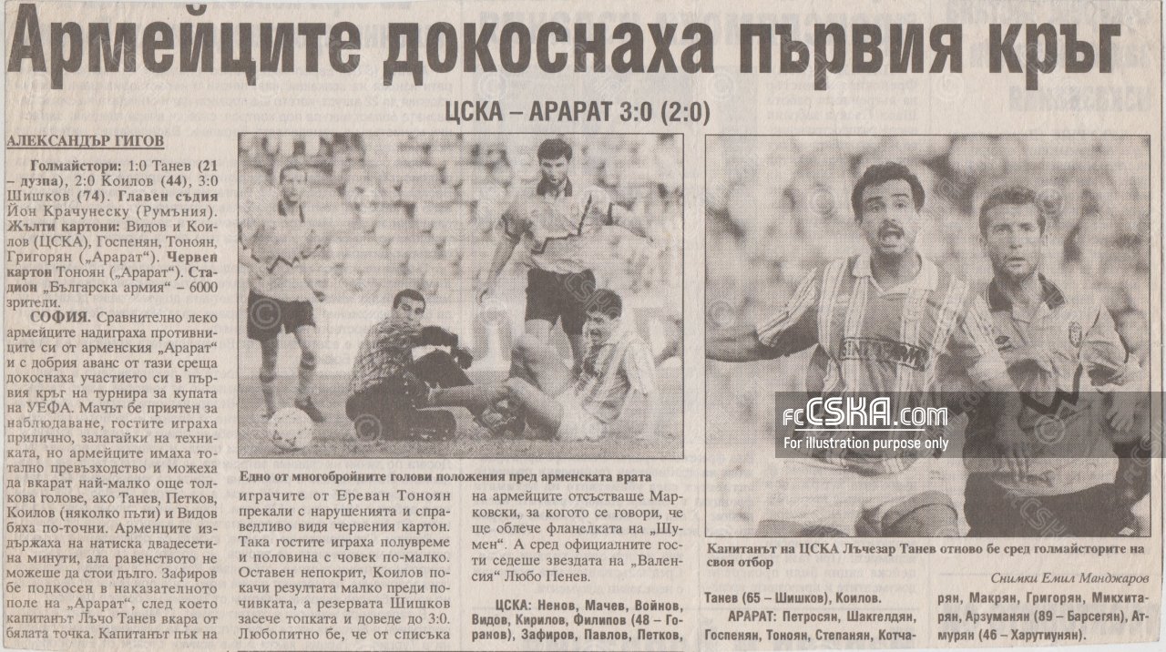 CSKA won against Ararat (Yerevan) with result 3:0 in match from Preliminary round — First Leg of UEFA Cup 1994/95 played on 9 August 1994 at 19:15 on „Bulgarska armia“ stadium, in Sofia. goalscorers for the army men were Lachezar Tanev (21′ from penalty), Hristo Koilov (44′) and Vanyo Shishkov (70′).