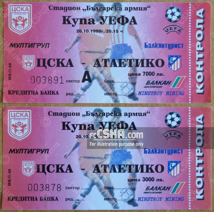 CSKA lost against Atlético (Madrid) with result 2:4 in match from Second round — First Leg of UEFA Cup 1998/99 played on 20 October 1998 at 20:15 on „Bulgarska armia“ stadium, in Sofia. goalscorers for the army men were Boncho Genchev (52′) and Valentin Naydenov (84′).