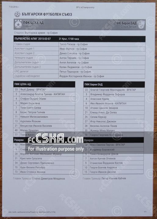 CSKA lost against Beroe (Stara Zagora) with result 0:1 in match from 21st round of „А“ Football Group 2014/15 played on 7 March 2015 at 17:00 on „Bulgarska armia“ stadium, in Sofia.