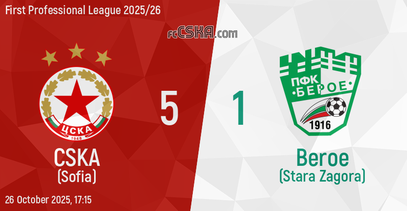 CSKA won against Beroe (Stara Zagora) with result 5:1 in match from 13th round of First Professional League 2025/26 played on 26 October 2025 at 17:15 on „Vasil Levski“ stadium, in Sofia. goalscorers for the army men were Petko Panayotov (39′), Ioannis Pittas (45′ and 51′), Ilian Iliev (48′) and Leandro Godoy (59′).