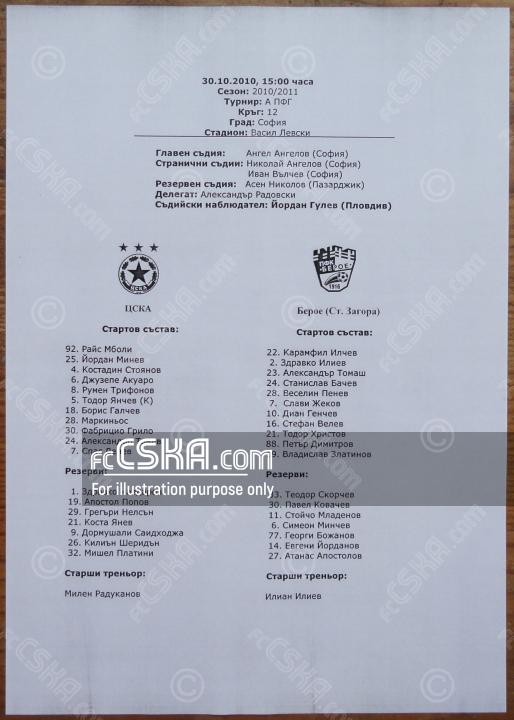 CSKA won against Beroe (Stara Zagora) with result 3:2 in match from 12th round of „А“ Football Group 2010/11 played on 30 October 2010 at 15:00 on „Vasil Levski“ stadium, in Sofia. goalscorers for the army men were Spas Delev (57′ and 72′) and Marquinhos (93′).