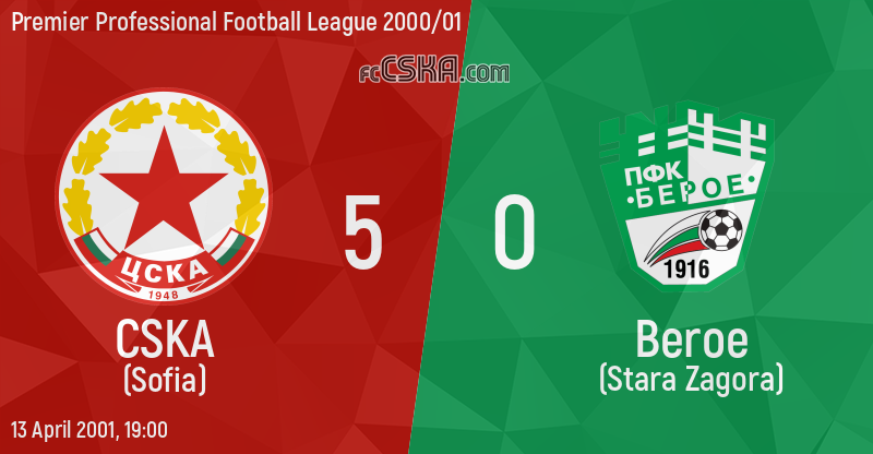 CSKA won against Beroe (Stara Zagora) with result 5:0 in match from 20th round of Premier Professional Football League 2000/01 played on 13 April 2001 at 19:00 on „Bulgarska armia“ stadium, in Sofia. goalscorers for the army men were Asen Bukarev (2′), Hristo Yanev (16′), Vladimir Manchev (19′), Svetoslav Petrov (72′) and Masena Moke (82′).