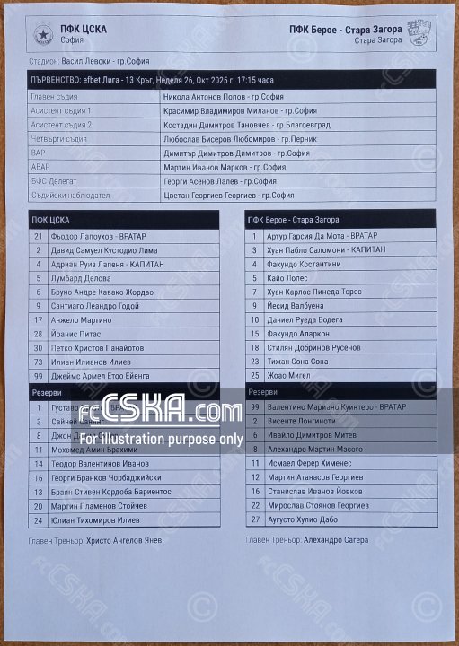 CSKA won against Beroe (Stara Zagora) with result 5:1 in match from 13th round of First Professional League 2025/26 played on 26 October 2025 at 17:15 on „Vasil Levski“ stadium, in Sofia. goalscorers for the army men were Petko Panayotov (39′), Ioannis Pittas (45′ and 51′), Ilian Iliev (48′) and Leandro Godoy (59′).