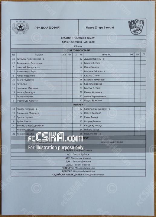 CSKA won against Beroe (Stara Zagora) with result 6:0 in match from 20th round of First Professional League 2017/18 played on 10 December 2017 at 17:00 on „Bulgarska armia“ stadium, in Sofia. goalscorers for the army men were Kiril Despodov (11′), Fernando Karanga (43′, 45′ and 52′), Tiago Rodrigues (77′) and Stanislav Manolev (88′).