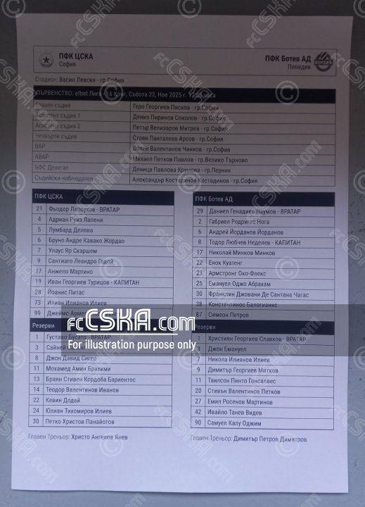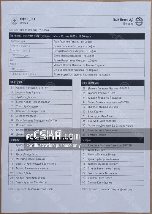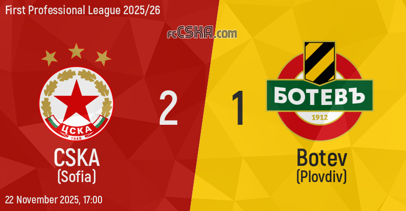 CSKA won against Botev (Plovdiv) with result 2:1 in match from 16th round of First Professional League 2025/26 played on 22 November 2025 at 17:00 on „Vasil Levski“ stadium, in Sofia. goalscorer for the army men was Leandro Godoy (72′ and 93′).
