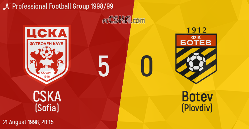 CSKA won against Botev (Plovdiv) with result 5:0 in match from 3rd round of „А“ Professional Football Group 1998/99 played on 21 August 1998 at 20:15 on „Bulgarska armia“ stadium, in Sofia. goalscorers for the army men were Valentin Stanchev (17′ and 60′), Boncho Genchev (47′ and 76′) and Rumen Hristov (87′).