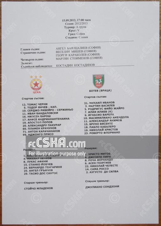 CSKA won against Botev (Vratsa) with result 3:0 in match from 5th round of „А“ Football Group 2012/13 played on 15 September 2012 at 17:00 on „Slavia“ stadium, in Sofia. goalscorers for the army men were Anicet (26′ from penalty and 62′) and Anton Karachanakov (80′).