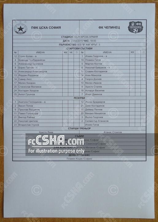 CSKA won against Chepinets (Velingrad) with result 7:0 in match from 3rd round of South-West „V“ Group 2015/16 played on 23 August 2015 at 18:00 on „Bulgarska armia“ stadium, in Sofia. goalscorers for the army men were Kostadin Hazurov (7′ from penalty and 9′), Yordan Yordanov (13′), Pavel Golovodov (33′ and 50′), Boris Galchev (40′) and Samir Ayass (85′).