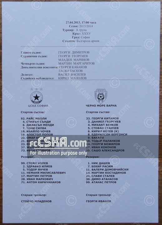 CSKA won against Cherno more (Varna) with result 2:0 in match from 34th round of „А“ Football Group 2013/14 - first 7 played on 27 April 2014 at 17:00 on „Bulgarska armia“ stadium, in Sofia. goalscorers for the army men were Ivan Stoyanov (36′) and Ivaylo Chochev (38′).